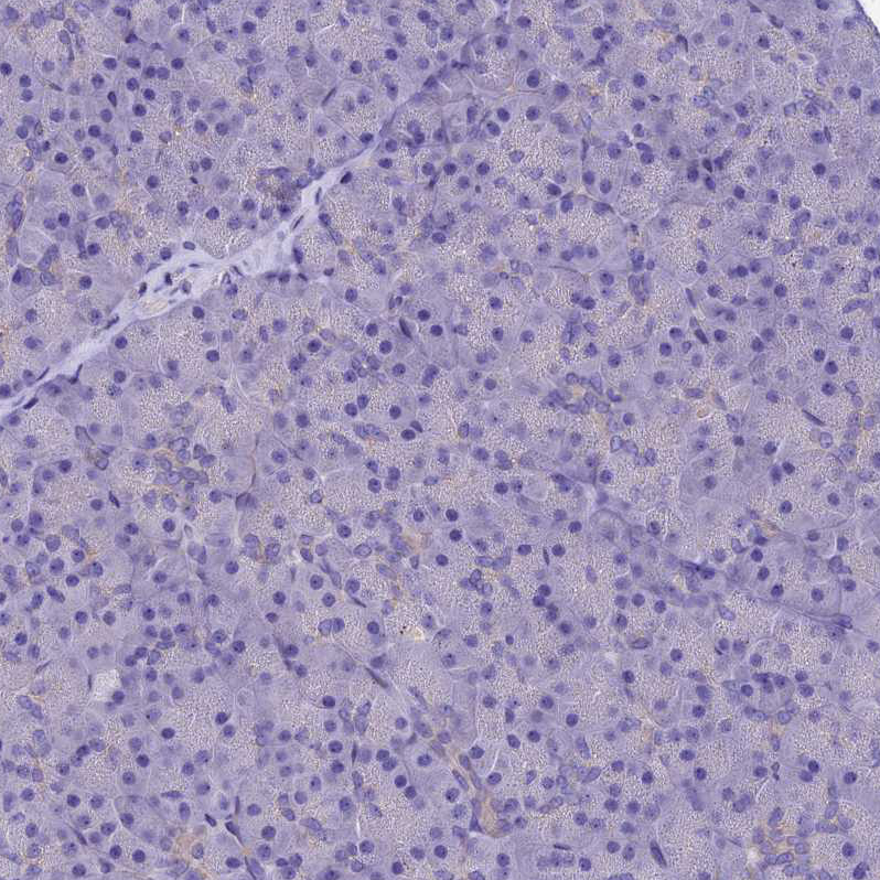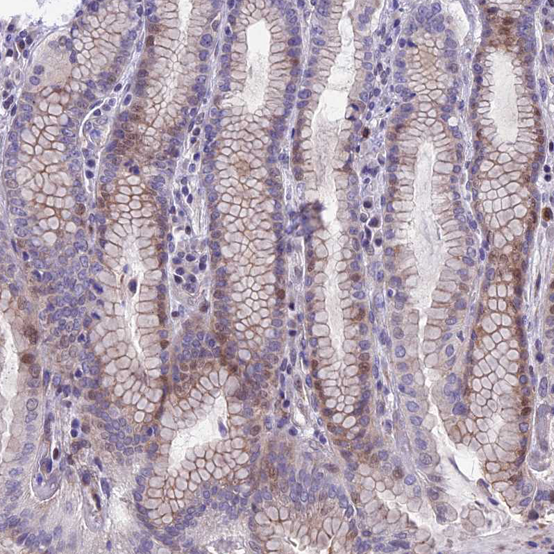 Immunohistochemical staining of human small intestine shows moderate membranous and cytoplasmic positivity in glandular cells.