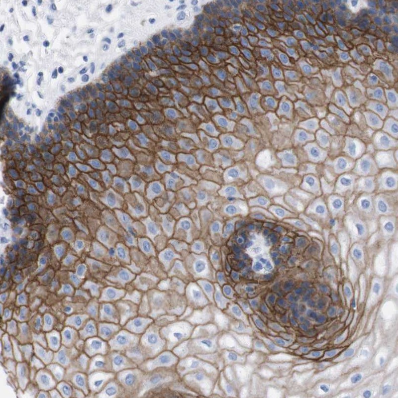 Immunohistochemical staining of human esophagus shows strong membranous and cytoplasmic positivity in squamous epithelial cells.