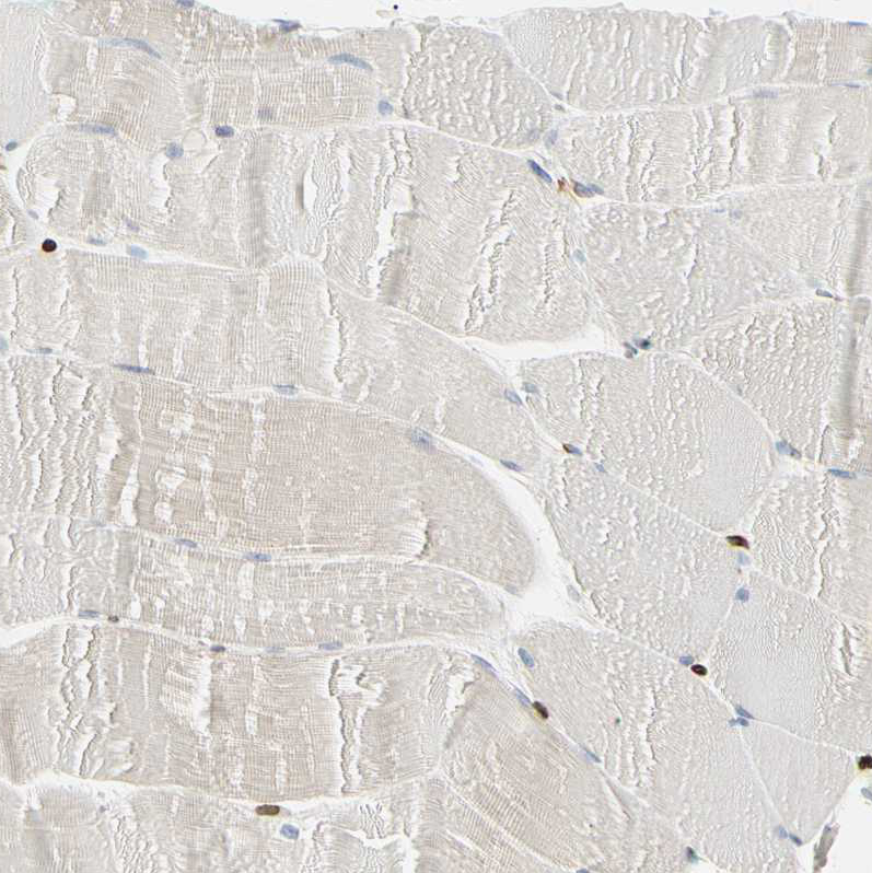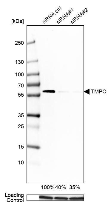 Immunohistochemistry analysis in human lymph node and skeletal muscle tissues using HPA008150 antibody. Corresponding TMPO RNA-seq data are presented for the same tissues.