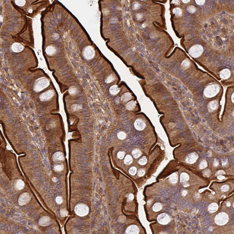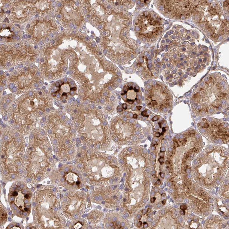 Immunohistochemical staining of human breast shows moderate cytoplasmic positivity in glandular cells.