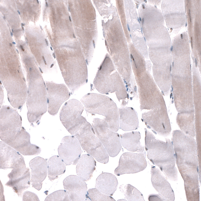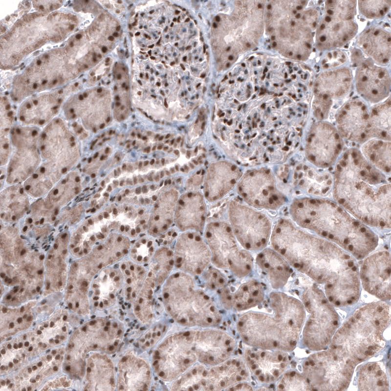 Immunohistochemical staining of human endometrium shows strong nuclear and moderate cytoplasmic immunoreactivity in glandular cells.