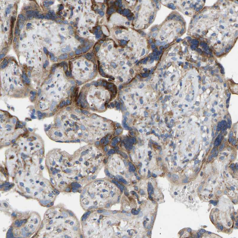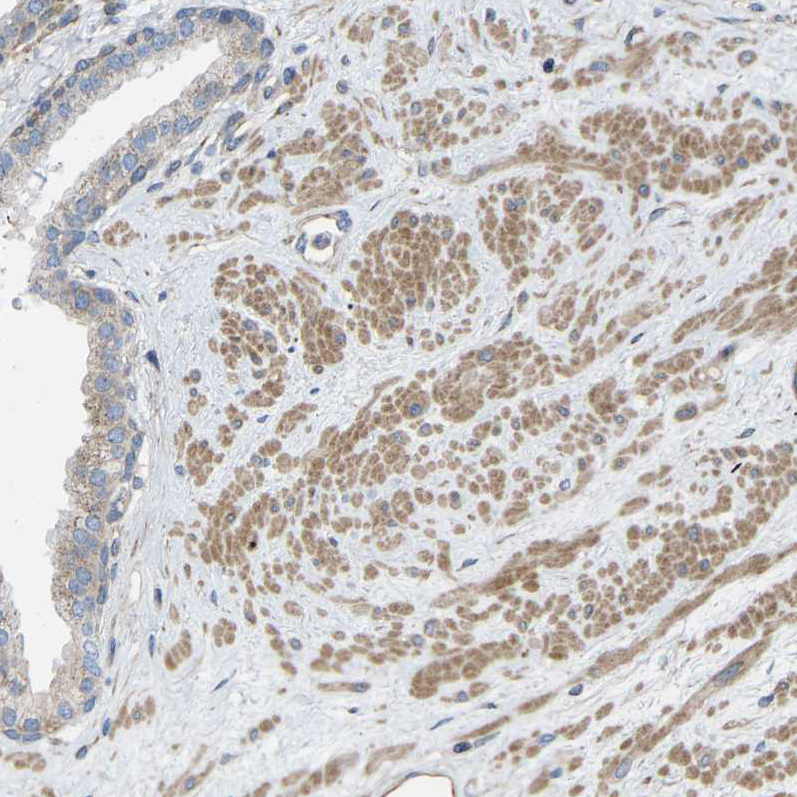 Immunohistochemical staining of human lower rectum shows moderate cytoplasmic/ membranous positivity in glandular cells.
