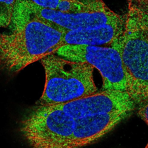 Immunofluorescent staining of human cell line HEK 293 shows localization to cytosol.
