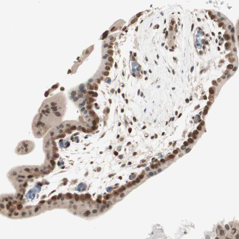 Immunohistochemical staining of human testis shows moderate to strong nuclear positivity in cells in seminiferous ducts.