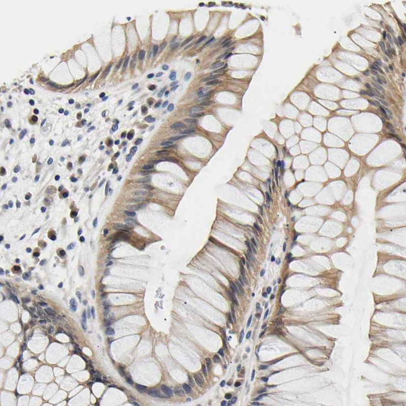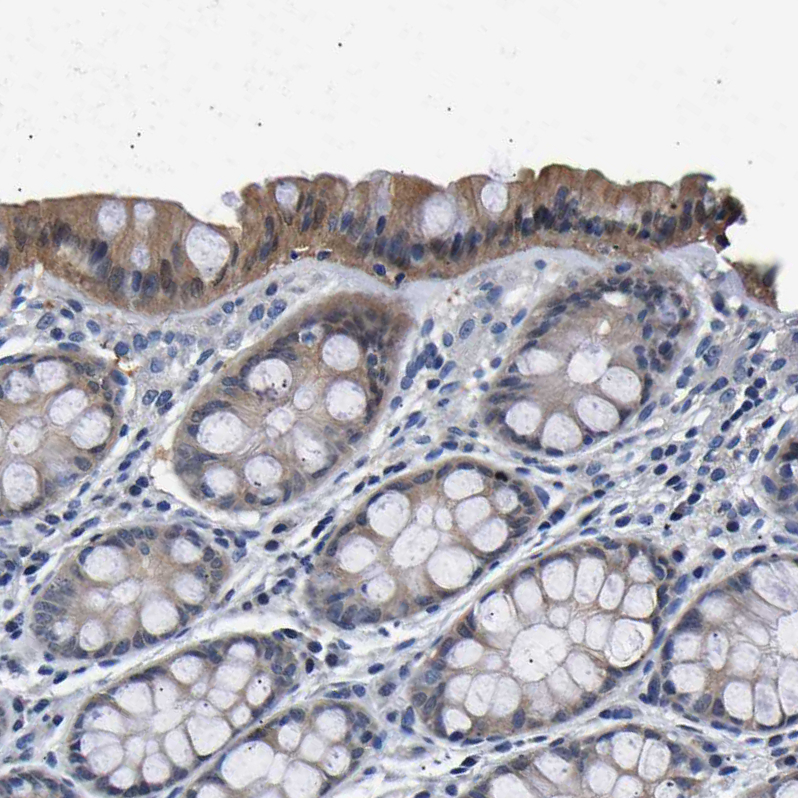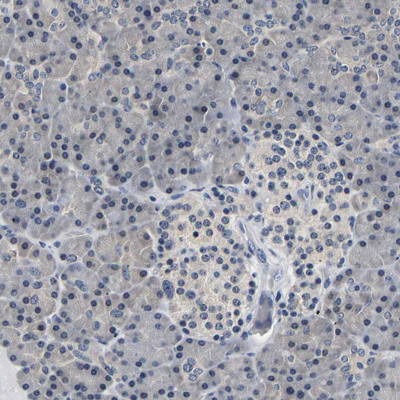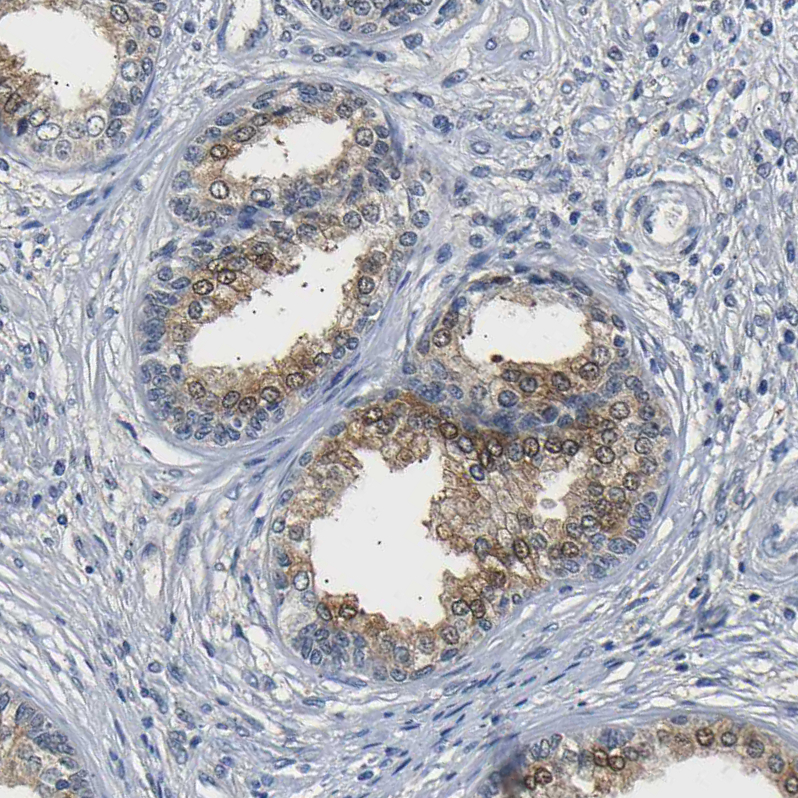 Immunohistochemical staining of human testis shows moderate to strong cytoplasmic positivity in cells in seminiferous ducts.