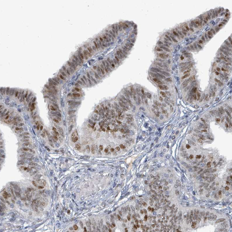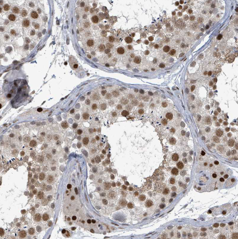 Immunohistochemical staining of human cerebral cortex shows moderate nuclear and weak cytoplasmic positivity in neurons.