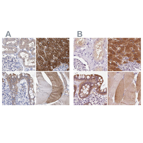 Immunohistochemical staining of human kidney, liver, rectum and skeletal muscle using Anti-UGP2 antibody HPA034696 (A) shows similar protein distribution across tissues to independent antibody HPA064836 (B).