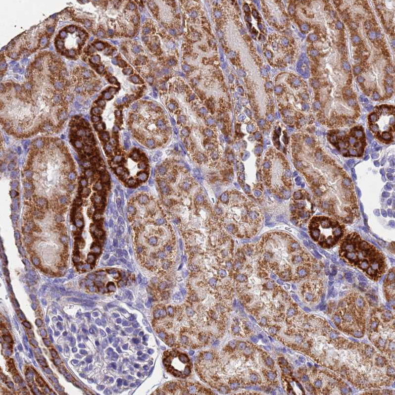 Immunohistochemical staining of human heart muscle shows strong granular cytoplasmic positivity in cardiomyocytes.