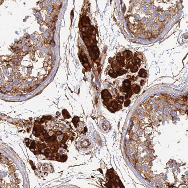 Immunohistochemical staining of human urinary bladder shows moderate cytoplasmic positivity in urothelial cells.