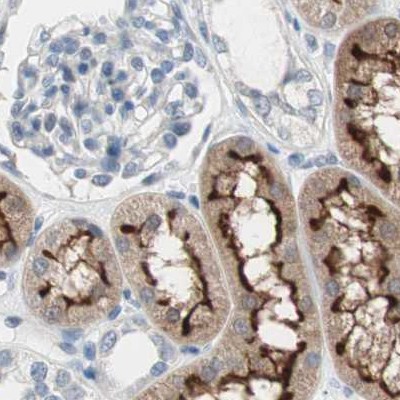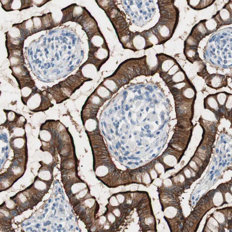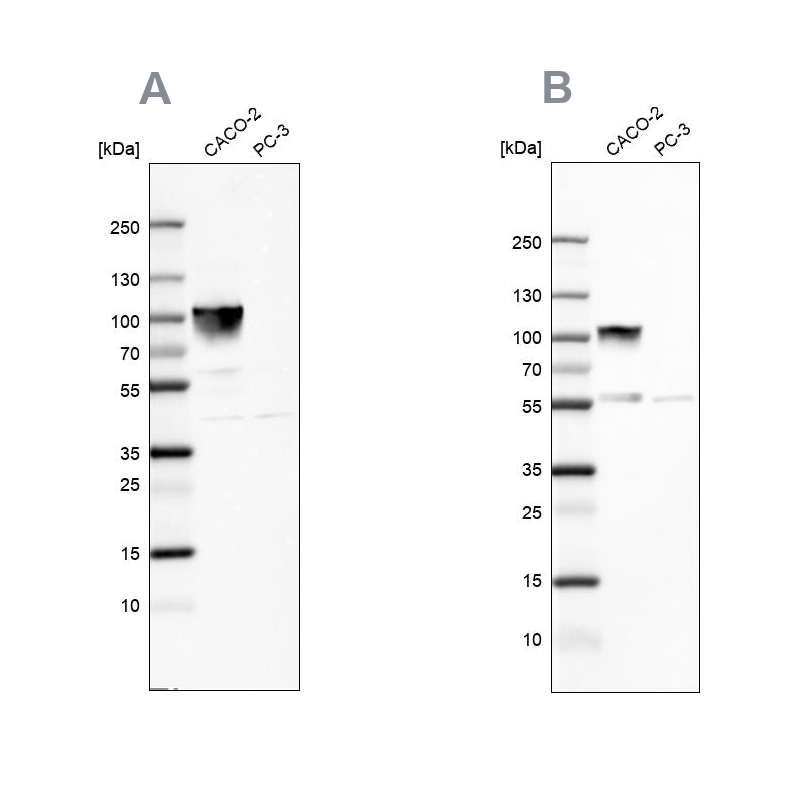 Immunohistochemical staining of human colon, gallbladder, kidney and liver using Anti-VIL1 antibody HPA006884 (A) shows similar protein distribution across tissues to independent antibody HPA006885 (B).