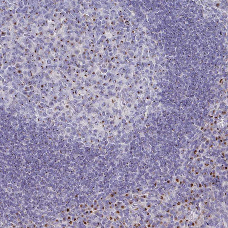 Immunohistochemical staining of human cerebral cortex shows moderate granular cytoplasmic positivity in neurons.