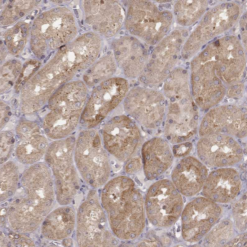 Immunohistochemical staining of human testis shows moderate cytoplasmic positivity in cells in seminiferous ducts and Leydig cells in addition to nuclear membranous positivity in subset cells in seminiferous ducts.