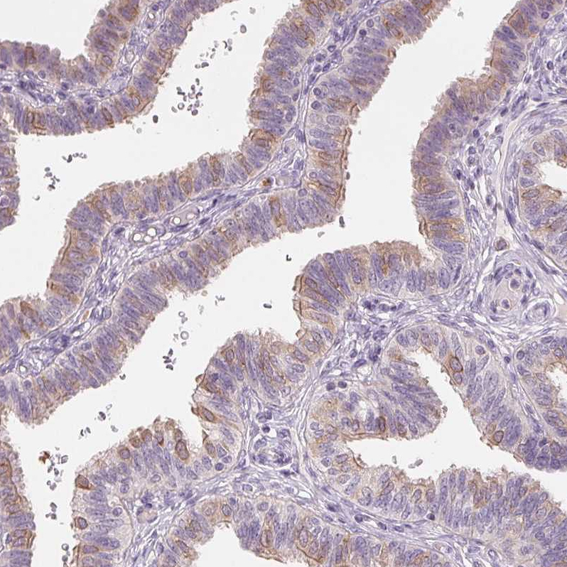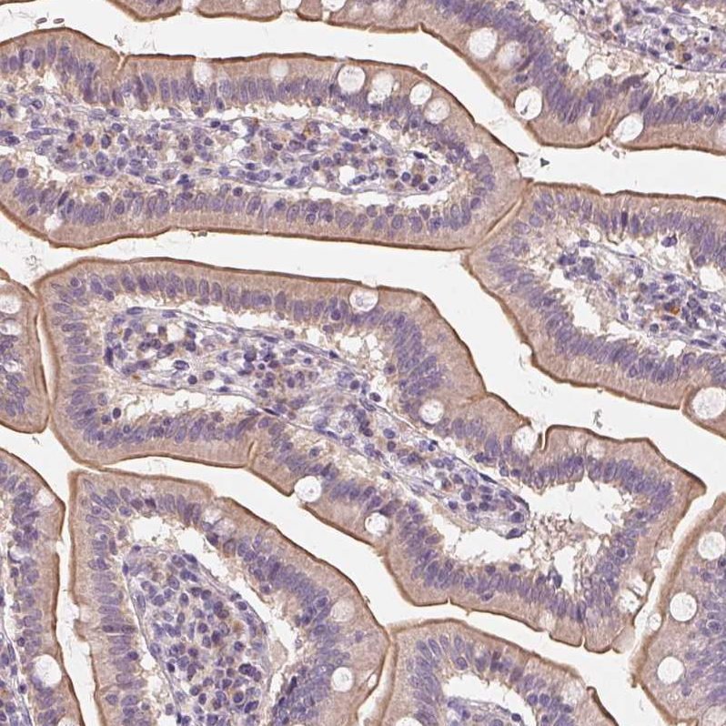 Immunohistochemical staining of human breast shows moderate membranous positivity in glandular cells.