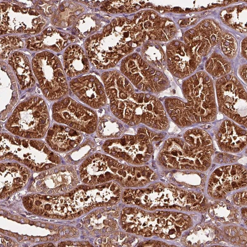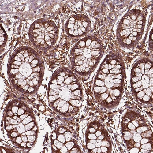 Immunohistochemical staining of human rectum shows strong cytoplasmic granular positivity in glandular cells.
