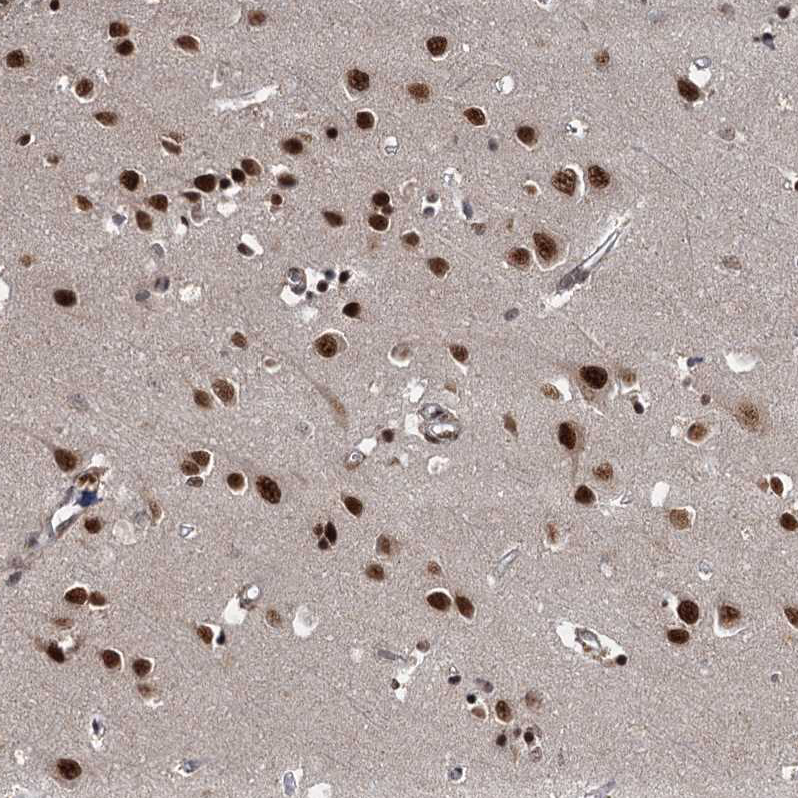 Immunohistochemical staining of human skeletal muscle shows strong nuclear positivity in myocytes.