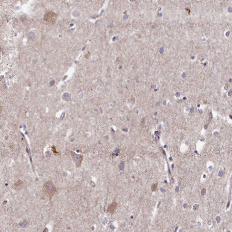 Immunohistochemical staining of human testis shows moderate granular cytoplasmic positivity in cells in seminiferous ducts.