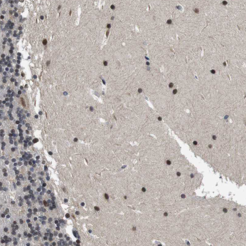 Immunohistochemical staining of human cerebral cortex shows strong nuclear positivity in neurons.