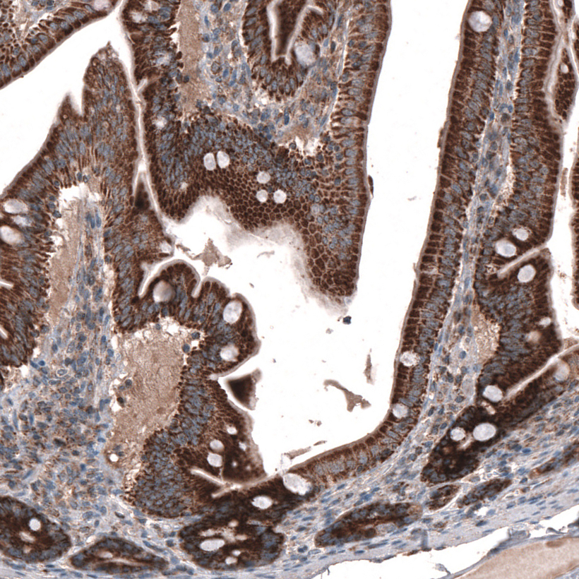 Immunohistochemical staining of human endometrium shows moderate to strong cytoplasmic positivity in glandular cells.