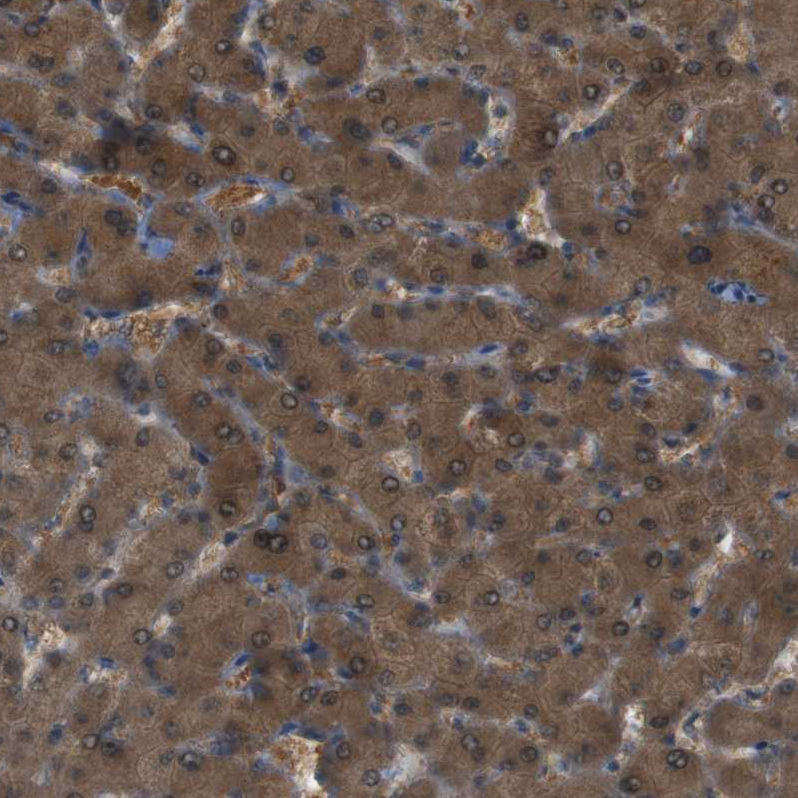 Immunohistochemical staining of human duodenum shows strong cytoplasmic and membranous positivity in glandular cells.