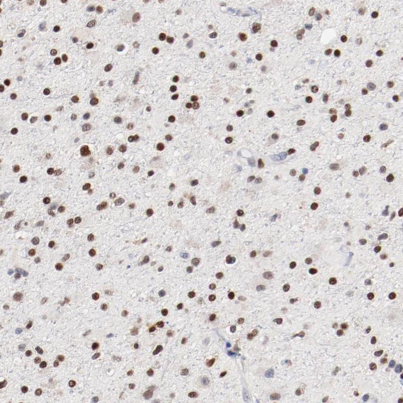 Immunohistochemical staining of human cerebral cortex shows moderate nuclear positivity in glial cells.