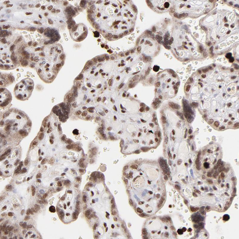 Immunohistochemical staining of human endometrium shows moderate nuclear positivity in glandular cells.
