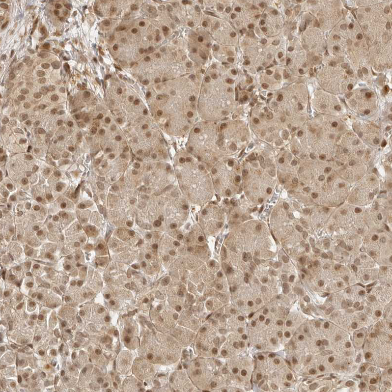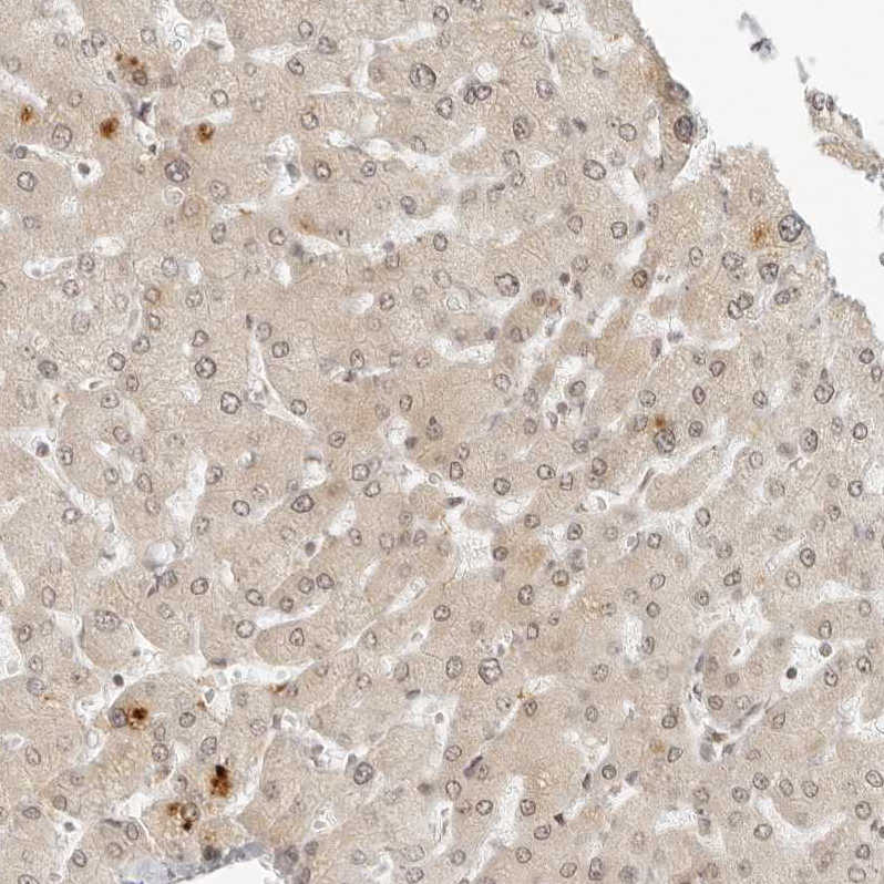 Immunohistochemical staining of human testis shows moderate nuclear positivity in subset of cells in seminiferous ducts.