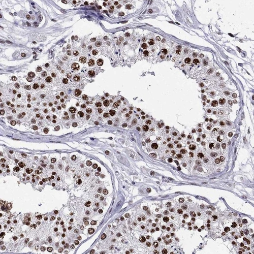 Immunohistochemical staining of human testis shows strong nuclear positivity in cells in seminiferous ducts.
